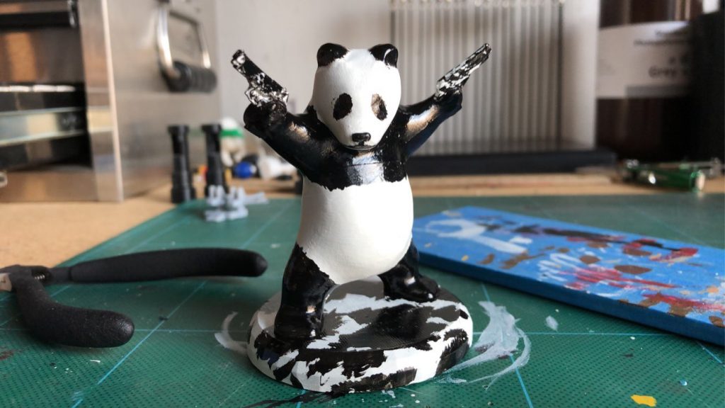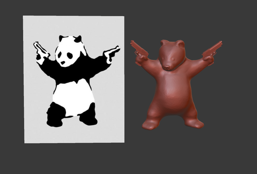 3D take on Banksy’s Panda with Guns. Sculpted in Blender to be printed as a birthday gift for a friend.